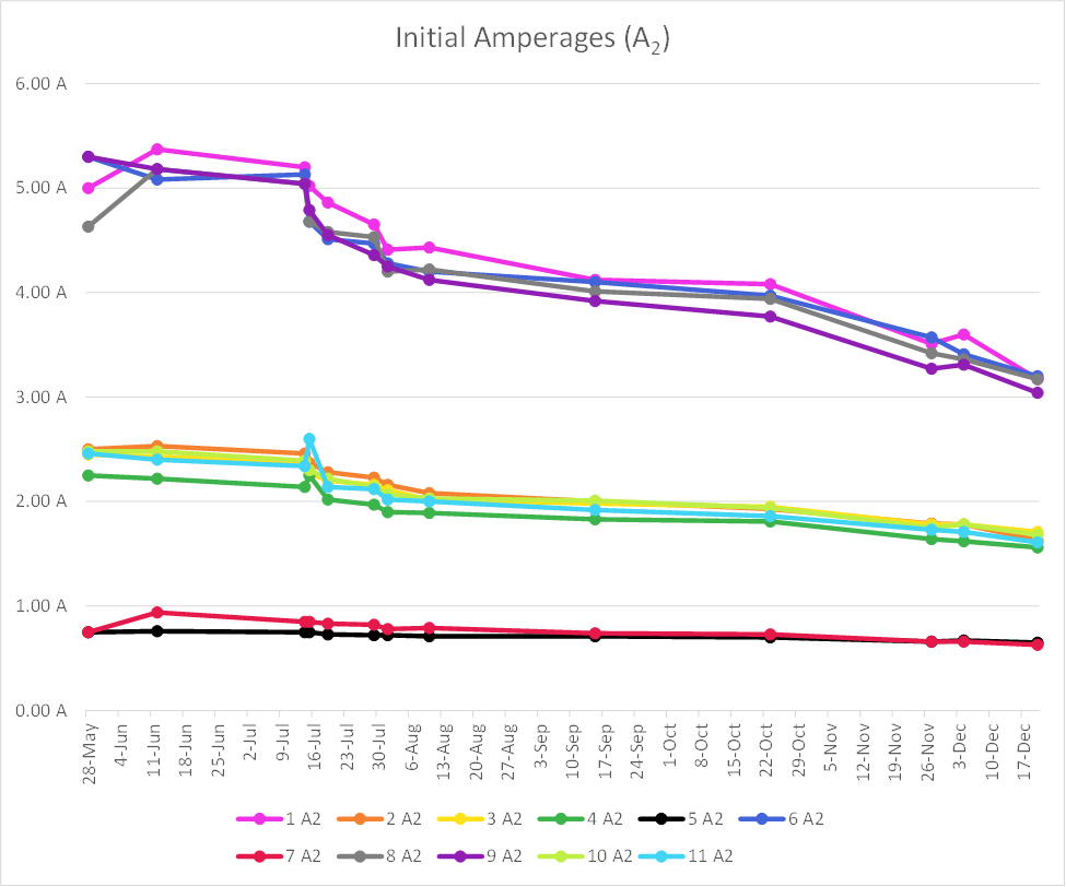 Here are graphs of the voltage and current tests over a 7 month test timeframe. The amperage is from the first 2-second "shorting". The subscript "2" on the "A" means the amps after 2 seconds. There is a similar amperage chart with a subscript of "19" which was the current after 19 seconds. (2-second short + 15-second recovery + 2-second short). Each of the measurements represent a worst case deployment scenario for a typical dual-deployment rocket flight.