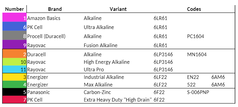 This next table shows all of the batteries tested grouped together by battery cell type. The great thing about the Battery Codes is they're always printed on the case and packaging, and it's an industry-standard code too. This allows you to easily determine the battery's basic construction of the cells and associated performance.