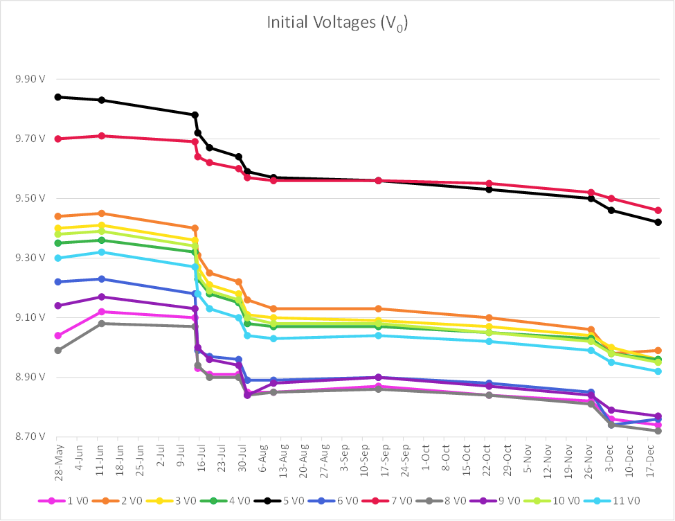 Here are graphs of the voltage and current tests over a 7 month test timeframe. The amperage is from the first 2-second "shorting". The subscript "2" on the "A" means the amps after 2 seconds. There is a similar amperage chart with a subscript of "19" which was the current after 19 seconds. (2-second short + 15-second recovery + 2-second short). Each of the measurements represent a worst case deployment scenario for a typical dual-deployment rocket flight.