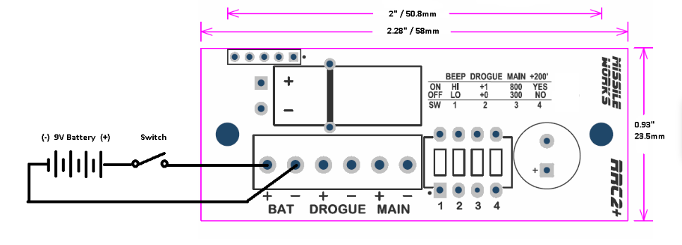 The RRC2+ is designed to be powered by a standard 9-volt alkaline or any 1S or 2S Lithium battery. Batteries must be mounted solidly in a battery box, zip tied, etc. If using a 9V battery clip it is advisable to use several wraps of electrical tape around battery and clip, before securing it to the sled. Always check the battery voltage before installing & before each flight! Even new batteries can be defective and have sub-par voltage.